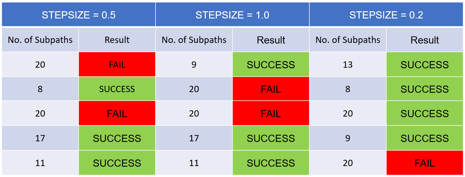 • It was observed that lower step sizes resulted in higher probability of finding the path, where the success rate was defined on number of sub-paths planned for the complete path.