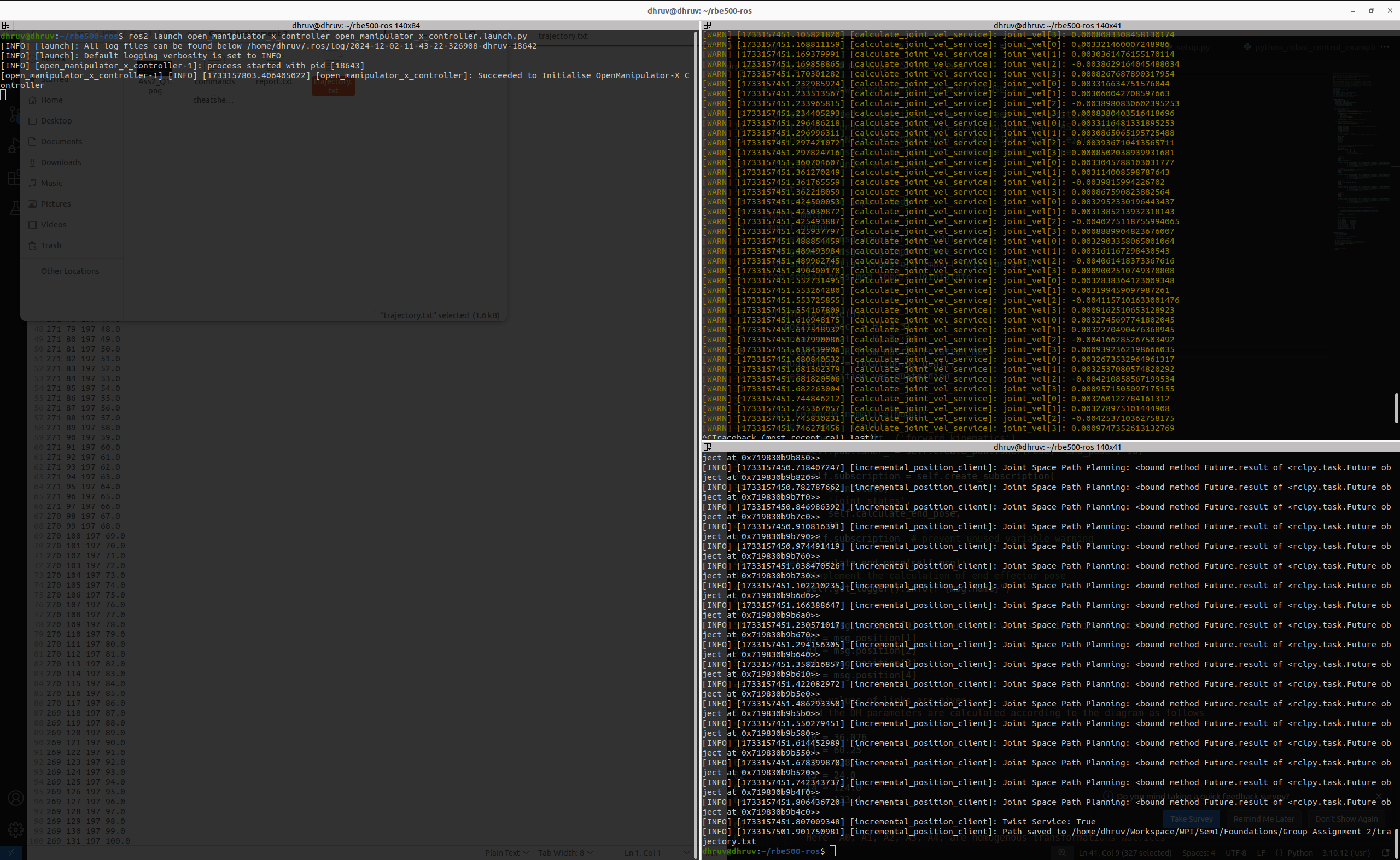 Top right terminal window shows the joint output values from the service cal_joint_vel which takes in end effector twist and gives out joint velocities and the bottom right terminal window shows the output while running the incremental_pos_client node.