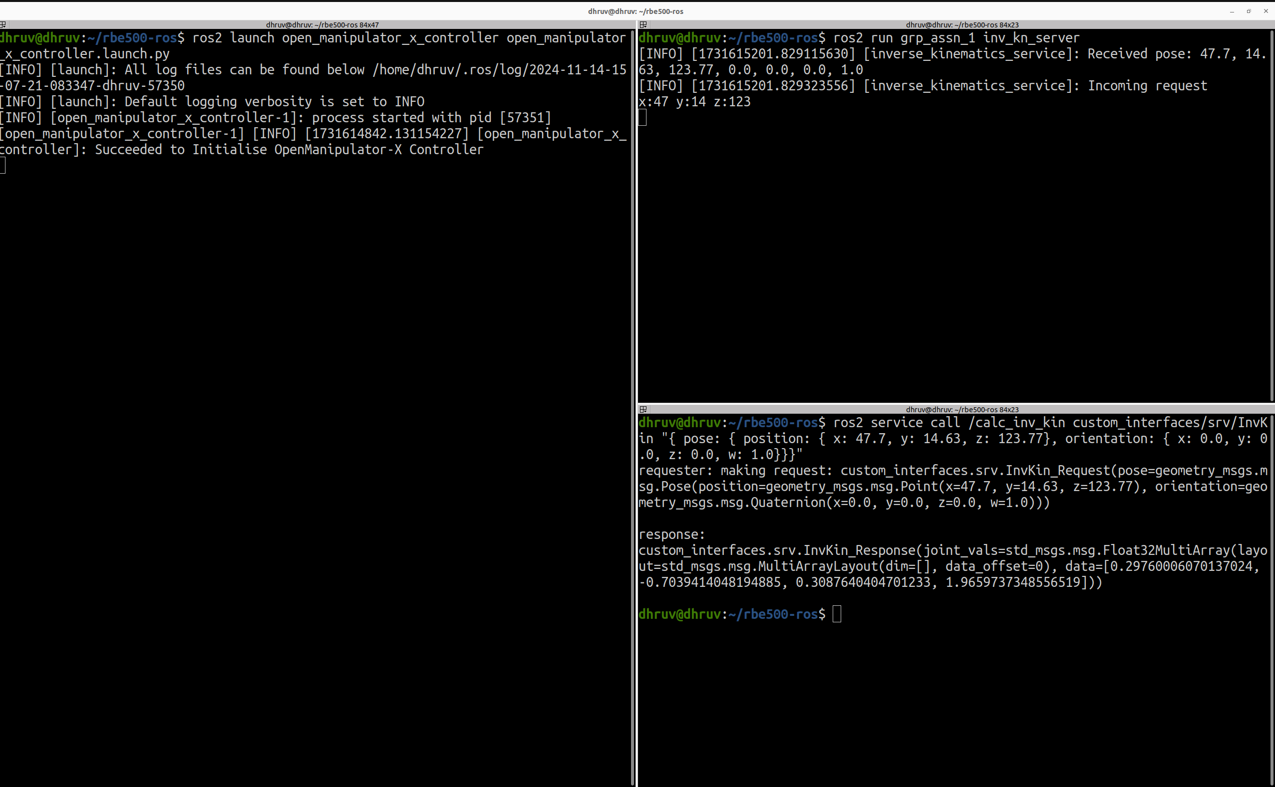 The Inverse Kinematics node is tested with three different inputs using the ros2 service call command and the terminal outputs are shown below: