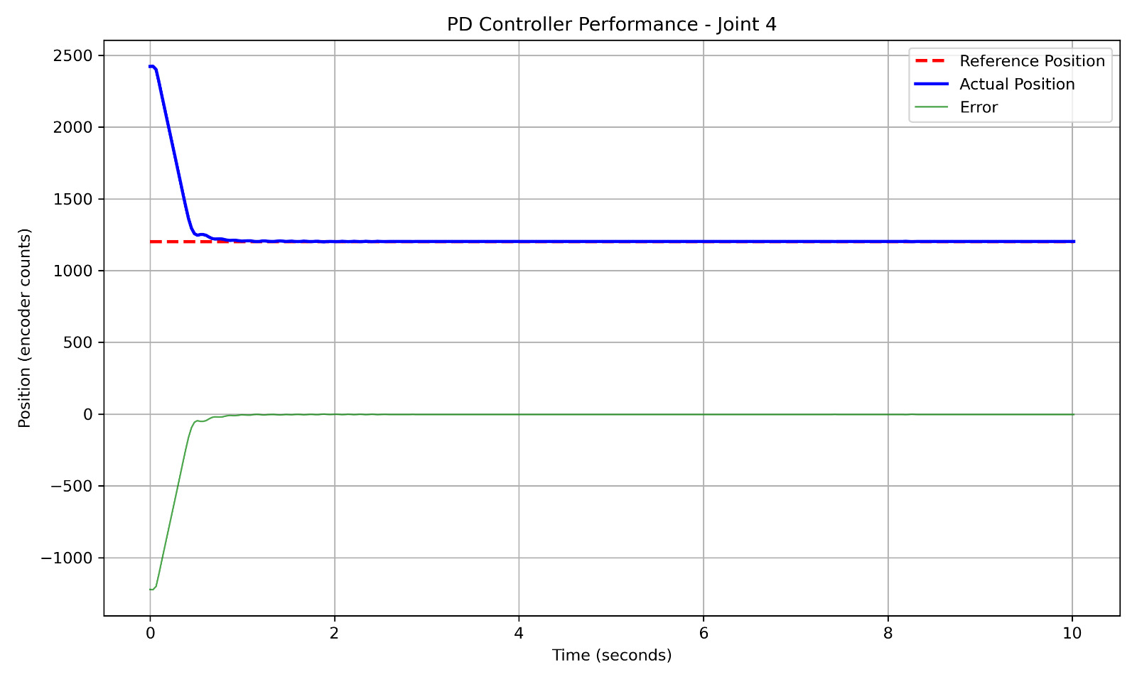 - You will need to tune the PD gains (you do not need to calculate them in this assignment; the dynamics equation of robot is not provided anyways). While tuning, start with very small $K_p$ gain and zero $K_d$ gain. Gradually increase the $K_p$ gain until you see some overshoot. Then, increase $K_p$ and $K_d$ gains together, and try to achieve a fast convergence with minimal overshoot.