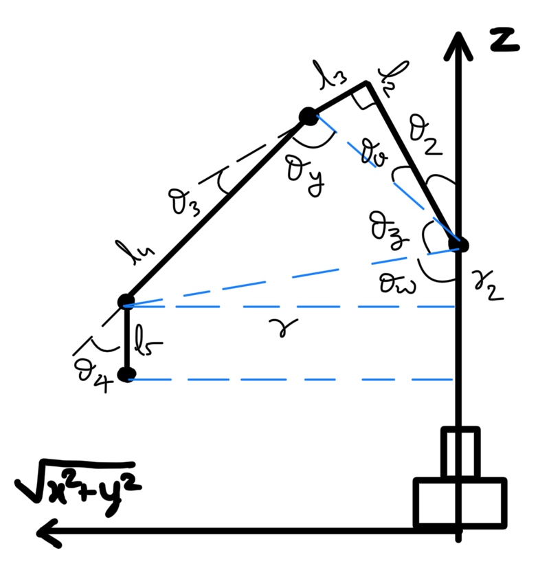 Using the geometry of the robot and the given pose, we can calculate the angles \(\theta_1\), \(\theta_2\), \(\theta_3\) and \(\theta_4\)