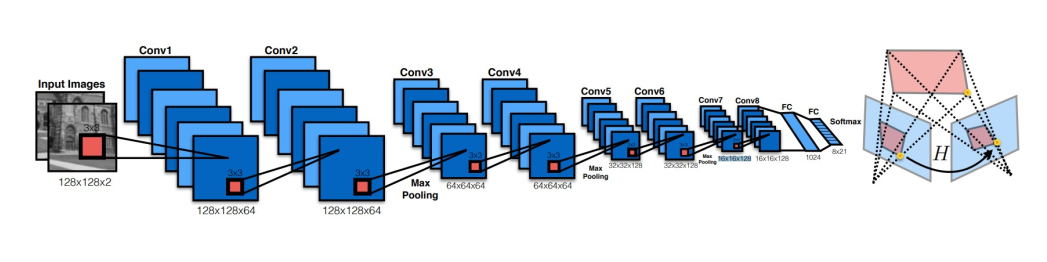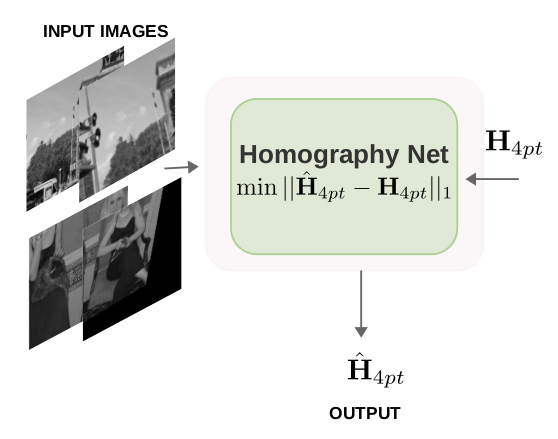 A supervised learning approach is a type of machine learning in which a model is trained on labeled data. This means that the algorithm learns from a dataset that already contains input-output pairs, where each input is associated with a correct output. In our implementation, the input of the model is the pair a pair of gray-scale image patches, and the ground truth labels are the homography between them. The objective of this optimization problem is to minimize the error between the estimated output of the neural network and the ground-truth homography. In this work we use the structure presented in HomographyNet.