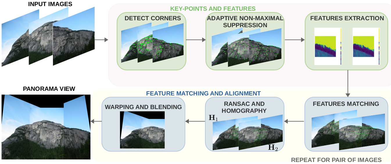 This section presents the implementation of panorama stitching considering the traditional formulation.The traditional approach involves the following steps: detecting key-points in images, extracting feature descriptors, and using Random Sample Concensus (RANSAC) to robustly estimate the homography matrix between images.